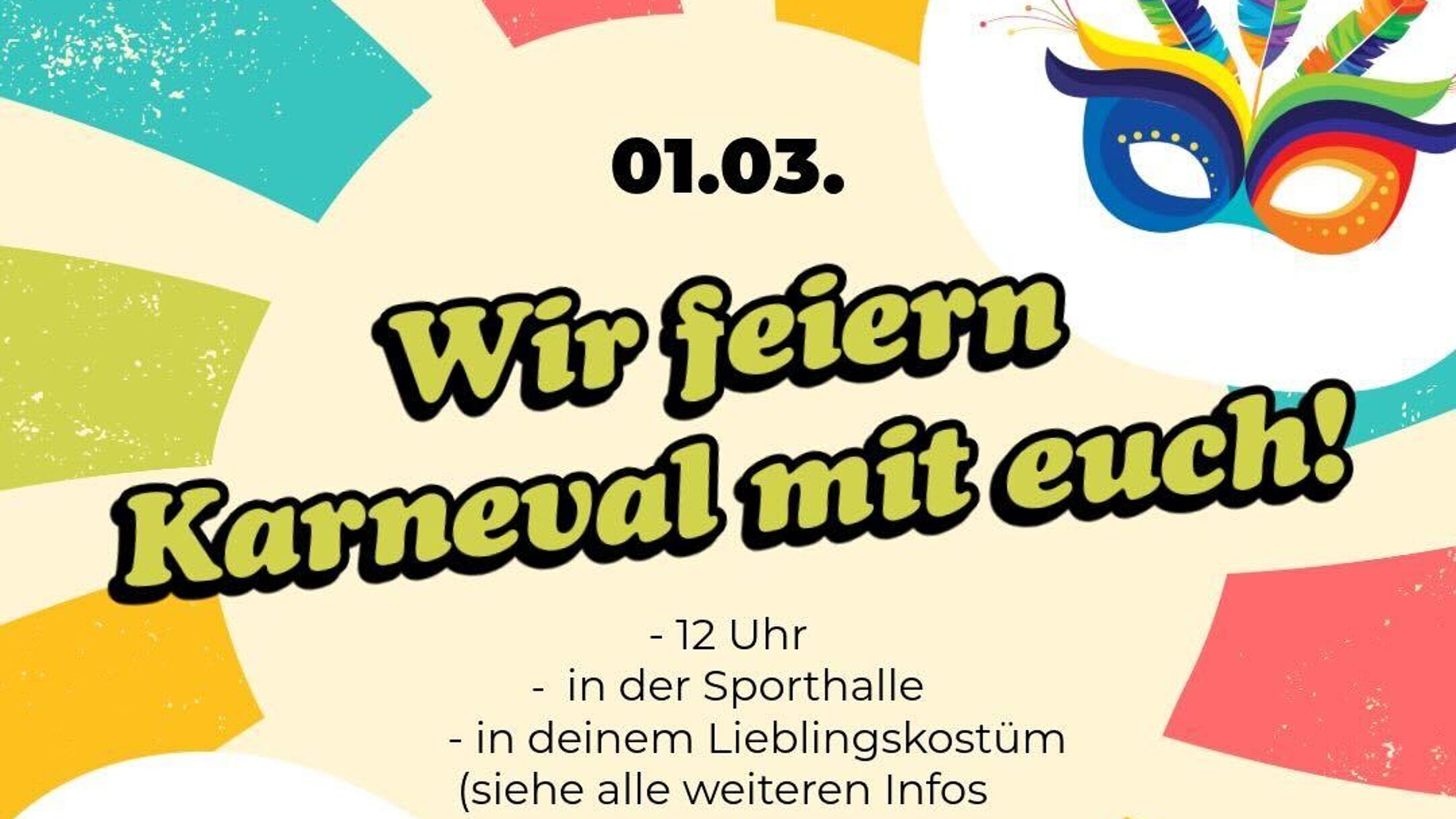 Der Jugendausschuss des TVG feiert Karneval mit euch!Wir laden alle Kinder, Freunde und Familie ab 5 Jahren herzlich ein, am 01.03. von 12-16 Uhr zu uns zu kommen! Es wird viele spaßige Aktionen geben, wie u.a. einen (freiwilligen) Kostümwettbewerb mit einem Preis zu gewinnen. Euer Kostüm könnt ihr sogar davor an verschiedenen Stationen noch perfektionieren!